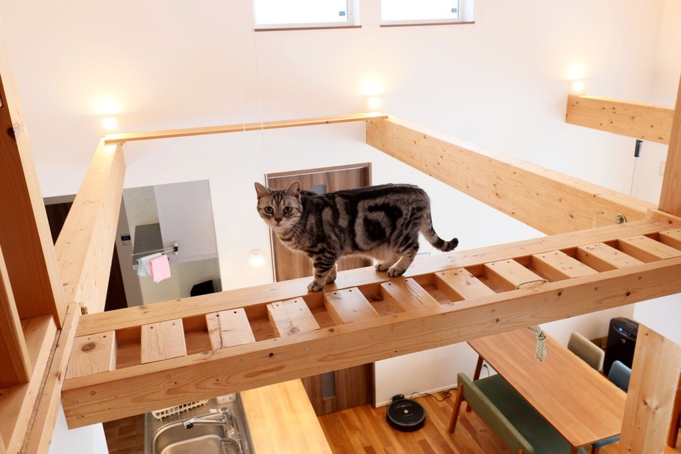 梁に取り付けたキャットウォークは、辻野建設工業からのプレゼント。すっかり、愛猫「ひめちゃん」のお気に入りスペースになりました。