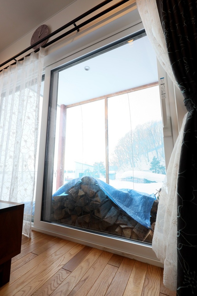 ストーブ用の薪は秋のうちに準備して、リビングからつながるテラスにストックしています。冬でも朝と晩以外は、薪ストーブだけで暖が取れるそうです。