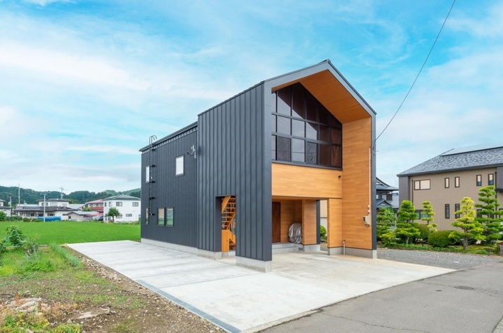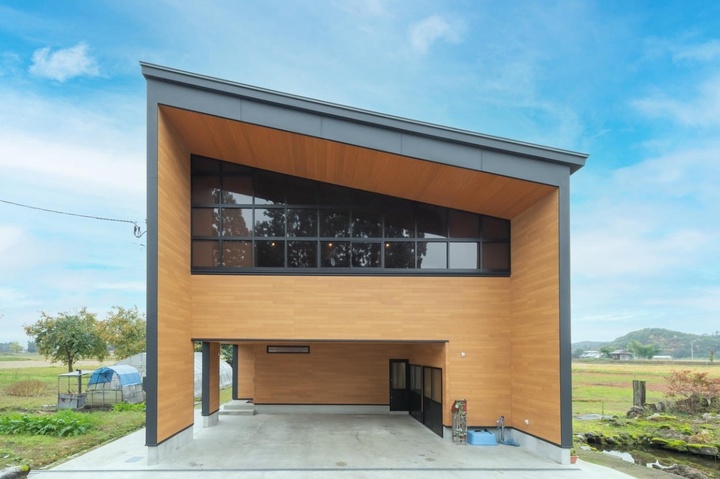 秋田県仙北市の田園エリアに建つI邸は、建物前面の広い1階ピロティと片流れ屋根に沿った形で続く2階の連続窓が特徴のモダンな外観です。