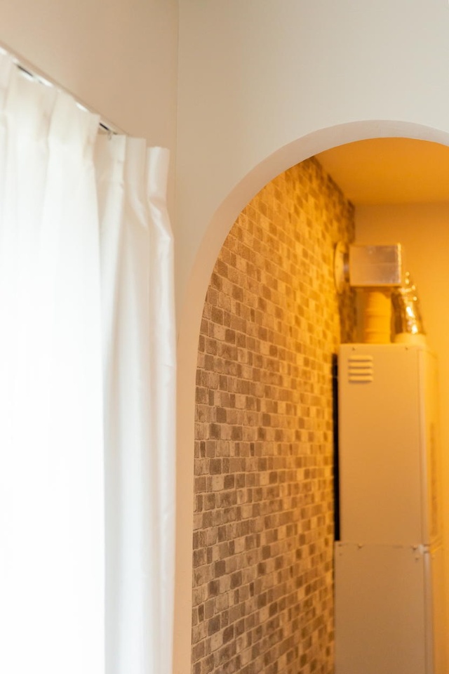 奥さまの希望でパントリーの入り口には、アールの下がり壁を採用。中の壁にはブロック模様のアクセントクロスを貼っています。