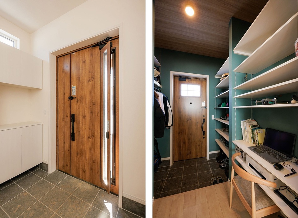 玄関はふたつ作りました。正面玄関(写真左)には、扉を閉めたまま風が通せる通風ドア(YKK AP「ヴェナート」)を採用。作業着で気兼ねなく入れる裏玄関(写真右)にはご主人の靴や上着、農作業に役立てているというドローンなどが並んでいます。片隅のPCスペースは、農作業の合間にさっと作業ができて便利なのだとか。