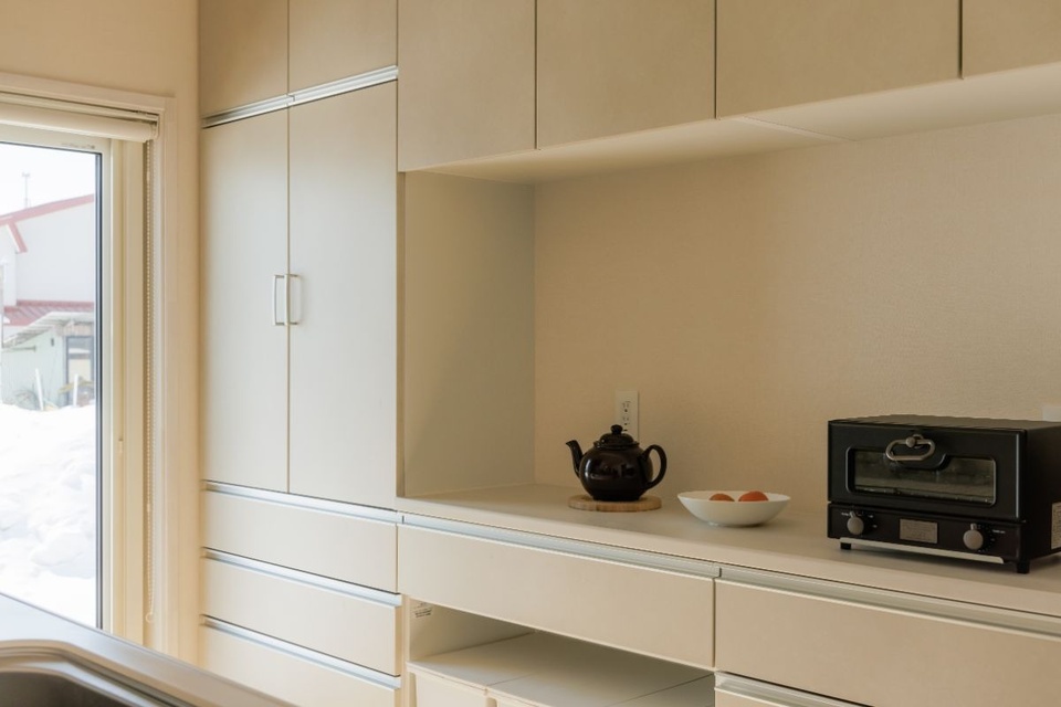 システムキッチンはタカラ製。奥様が選んだ食器棚は、淡いグレージュの色味とマットな仕上がりが上品な雰囲気です。