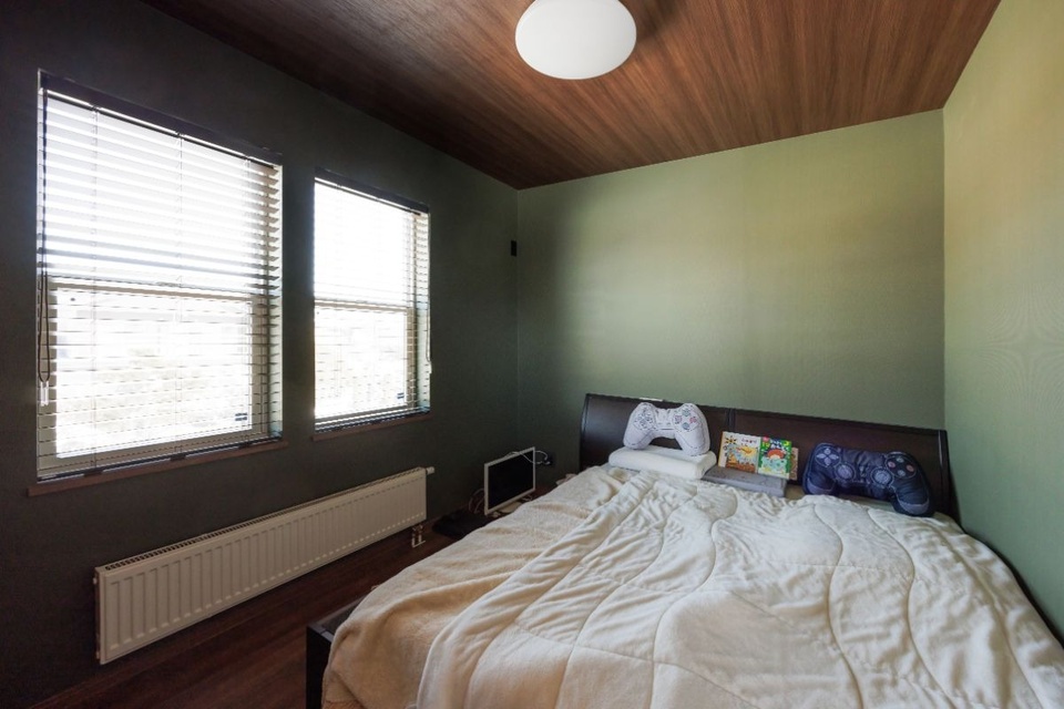 LDKはオープンな間取りにした一方で、「気持ちのオンオフができるように」と二階には家族のそれぞれに個室を設けました。「入った瞬間にリラックスモードに切り替わるよう、自室は落ち着いた色合いにしています」(ご主人)