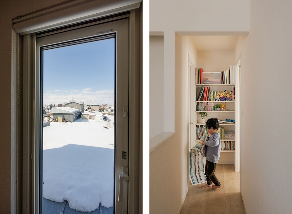 二階ホールには屋根の上に出られる窓を設置。いずれは山や夕日を望めるルーフバルコニーにする計画です。反対側には絵本コーナーも。