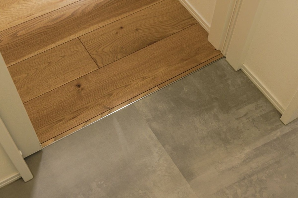 床材の境には樹脂製の見切りが入るのが一般的ですが、その厚みが気になっていたKさん。社長に相談し、金属製の見切り材を入れることですっきりとした印象に仕上げました。