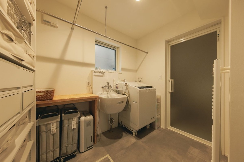 洗濯関係の家事を一箇所で済ませられるよう、ランドリールームは広めに作りました。洗濯機の隣には靴や汚れ物を洗えるSKシンクを設置。「お風呂場でものを洗うということもなくなり、快適です」