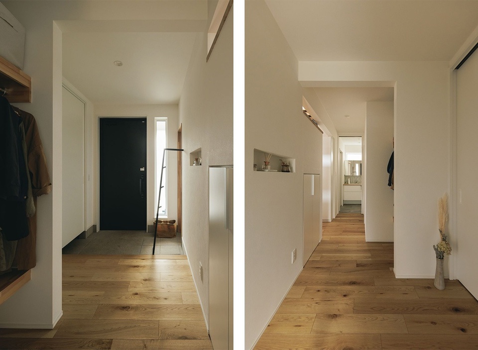玄関ホール周りにはシューズクロークやコート掛けなどもあり、片付けしやすく、またすっきりとした印象です。