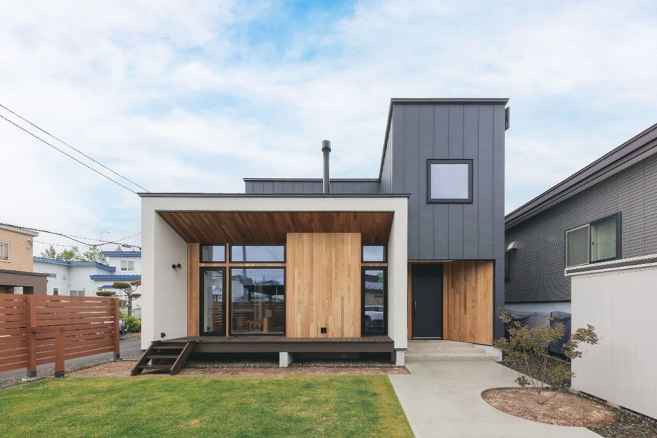 帯広市中心部に建つK邸は、角地であることを活かし、開放的な外観をもつモダンスタイルの住宅です。