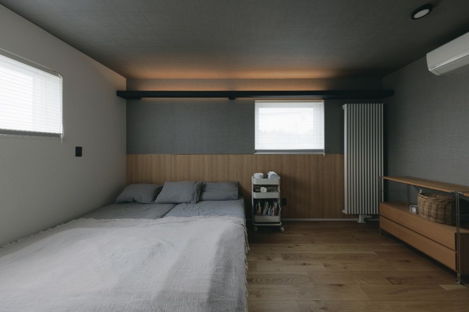 寝室はアクセントクロスと間接照明で落ち着いた雰囲気に仕上げました。「照明は複数箇所につけ、子どもの寝かしつけの前にはゆったりと過ごせるよう少し暗めに、など使い分けています」