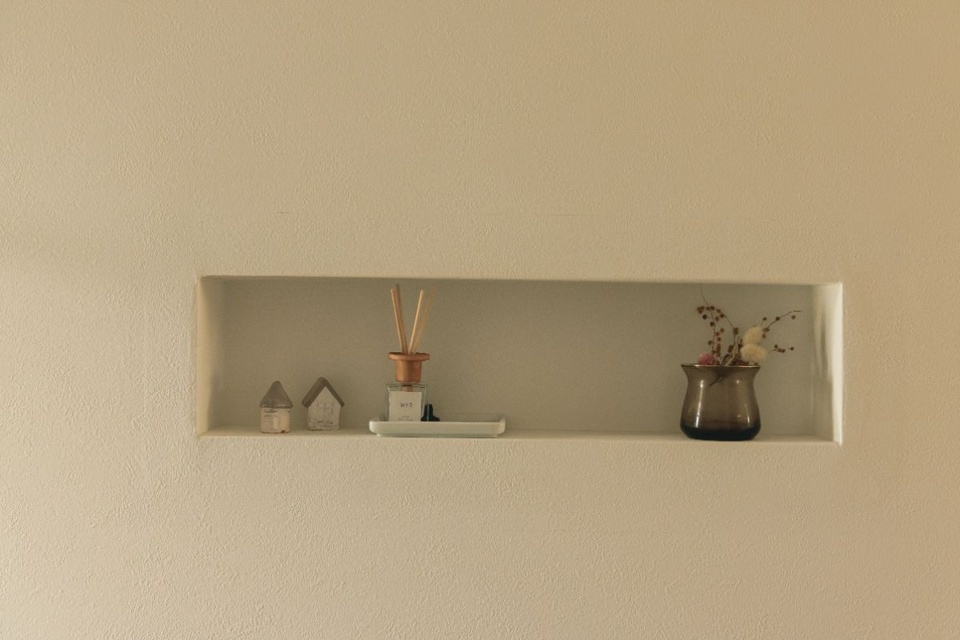 カップボードの上には白のサブウェイタイルを貼りました。キッチンの腰壁にはニッチを作り、小物の置き場とすることで、ディスプレイとしても使いやすく、また片付きやすいLDKに。
