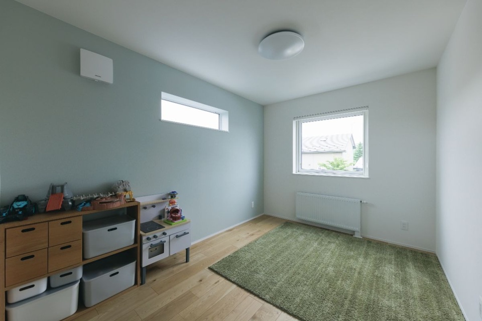 ソファの奥には約4帖ほどのフリースペースもあり、子どもたちが収納からおもちゃを出し入れして自由に遊んでいます。