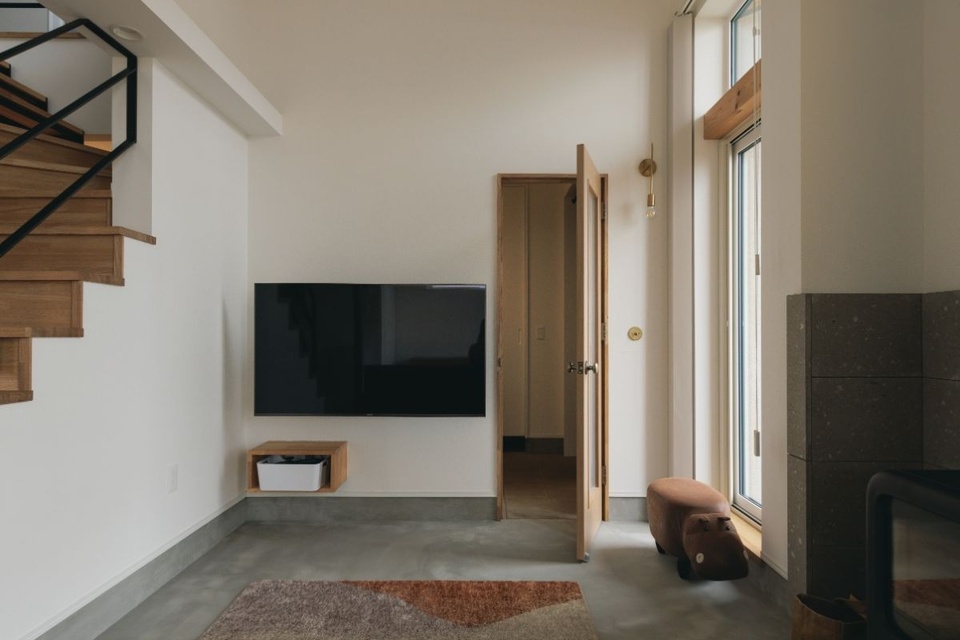 薪を運びやすくするために、玄関土間とリビングの土間も扉一枚でつながっています。