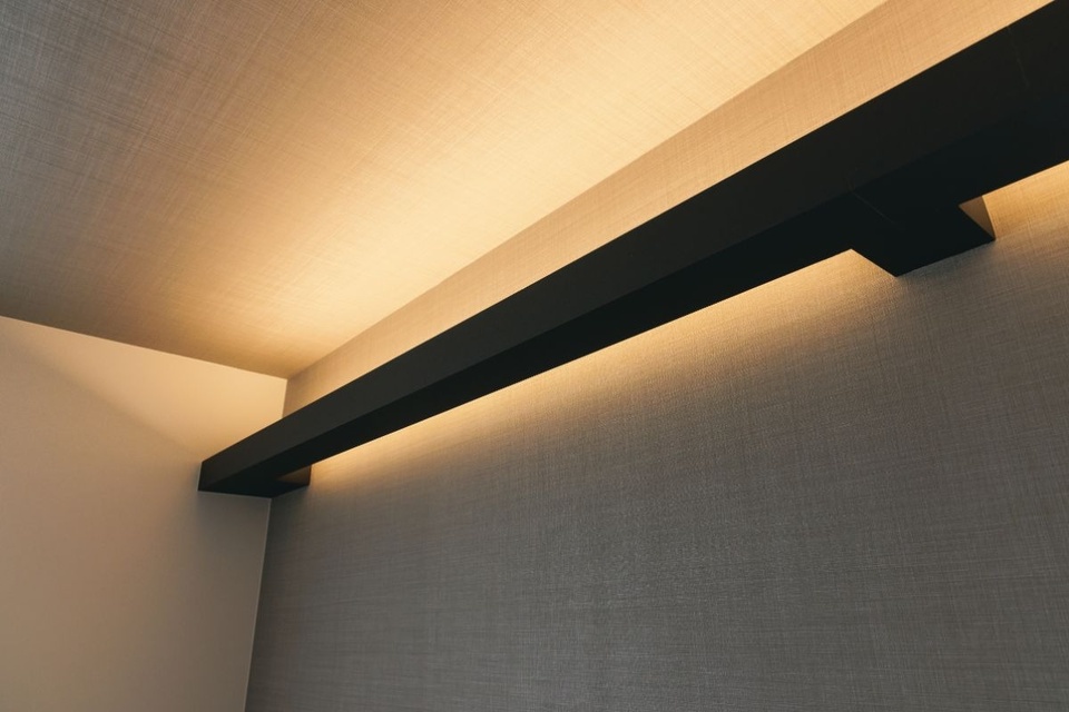 「ホテルのような雰囲気にしたくて、クロスとクロスの壁見切を金色にできませんかと相談したんです。真鍮で仕上げてもらい、思い通りの部屋になりました」