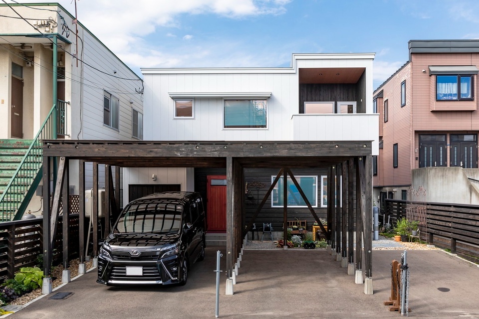 おしゃれな木製カーポートに、ホワイトのガルバリウム×木の外装がモダンなEさんのお宅は、ご夫婦+お子さん2人と、奥さんのお母さんが暮らす2世帯住宅です。