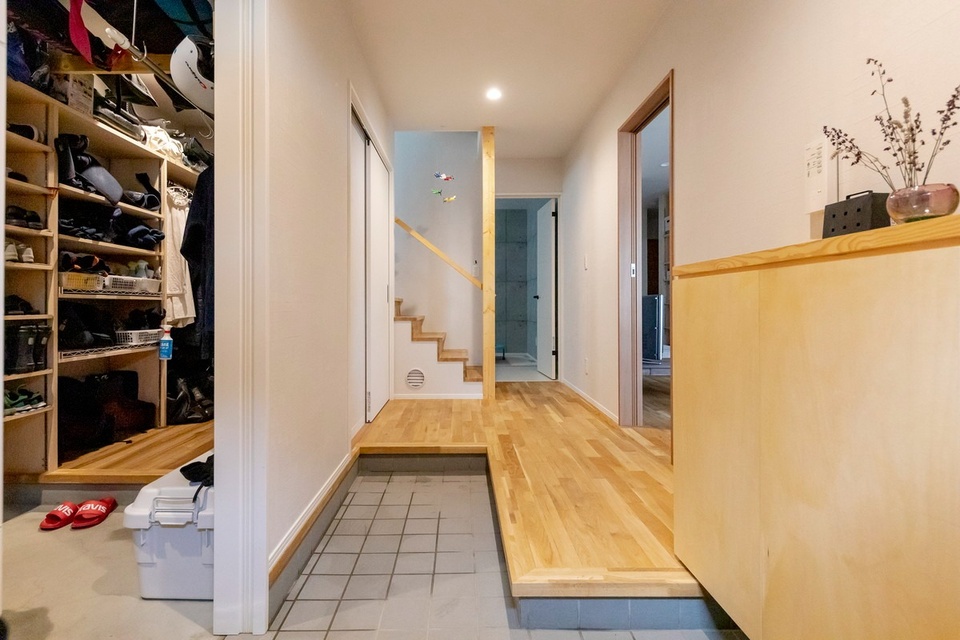 玄関に入ると左手にクローク、右手にお母さんの居住スペースが配置されており、正面の階段から2階に上がります。