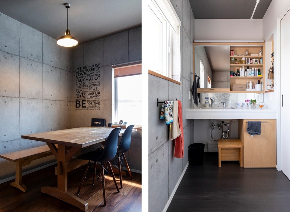 左 コンクリート打ちっぱなし風の壁紙で、まるでダイナー・カフェのようなダイニングスペース。