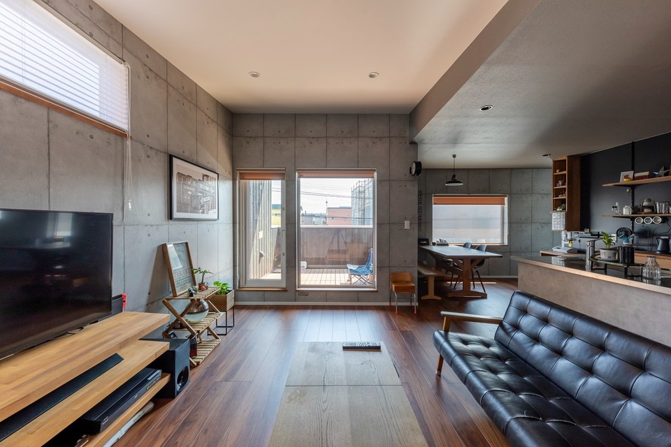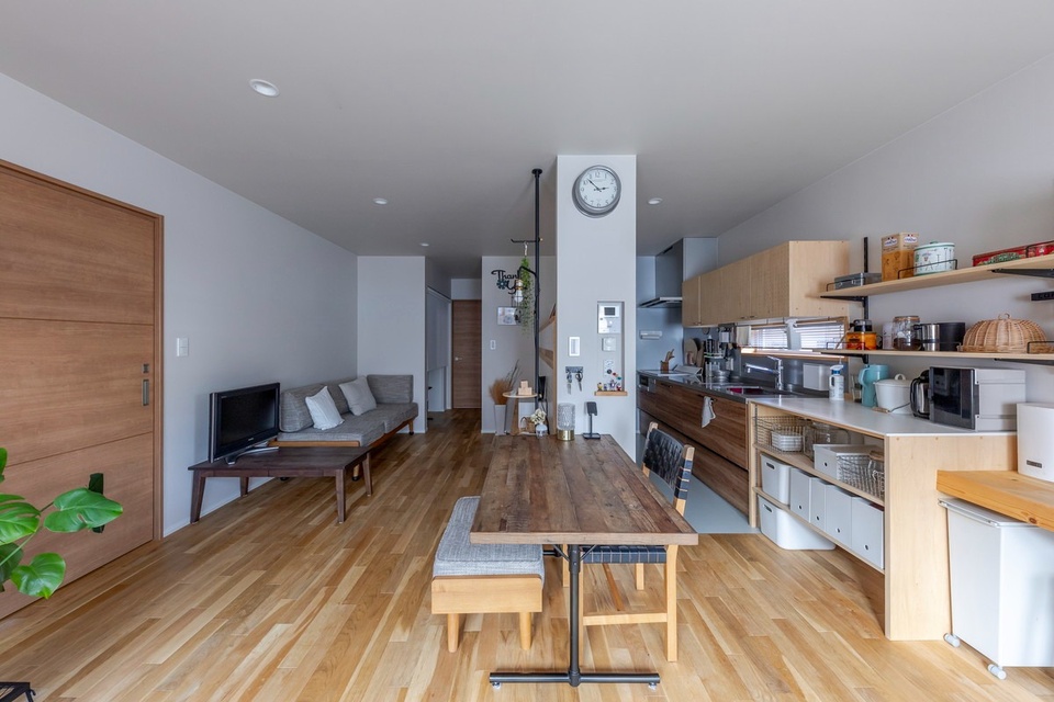 収納を備えた仕切り壁で、キッチンとテレビスペースを緩やかに分離しています。