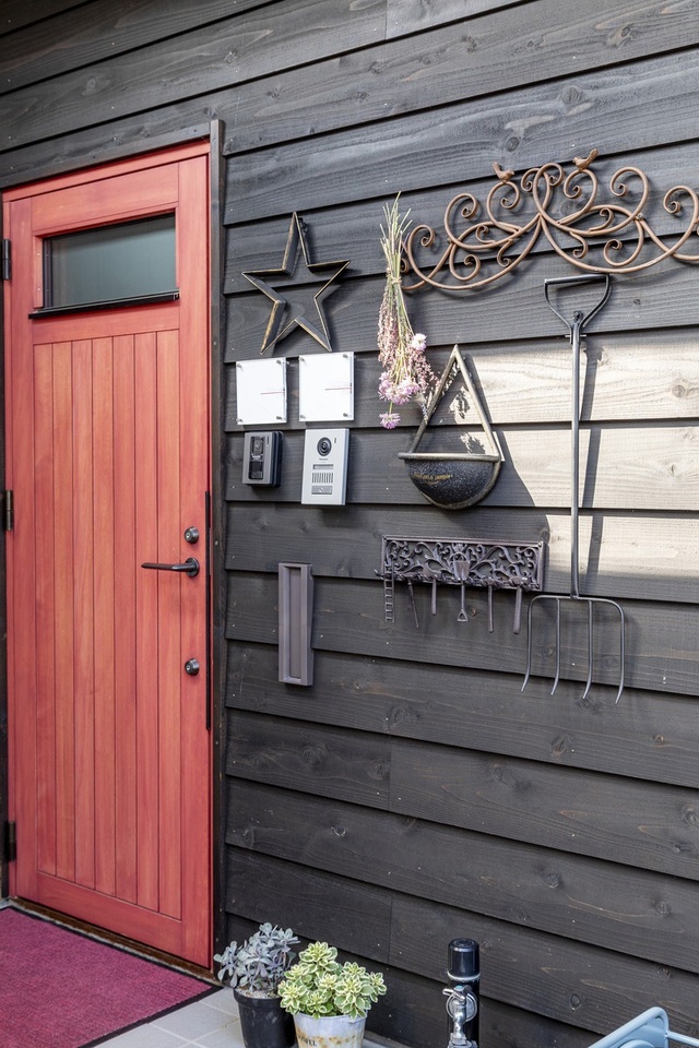 赤い木製の断熱ドアが板張りの外装にぴったり。中を拝見するのが楽しみです。