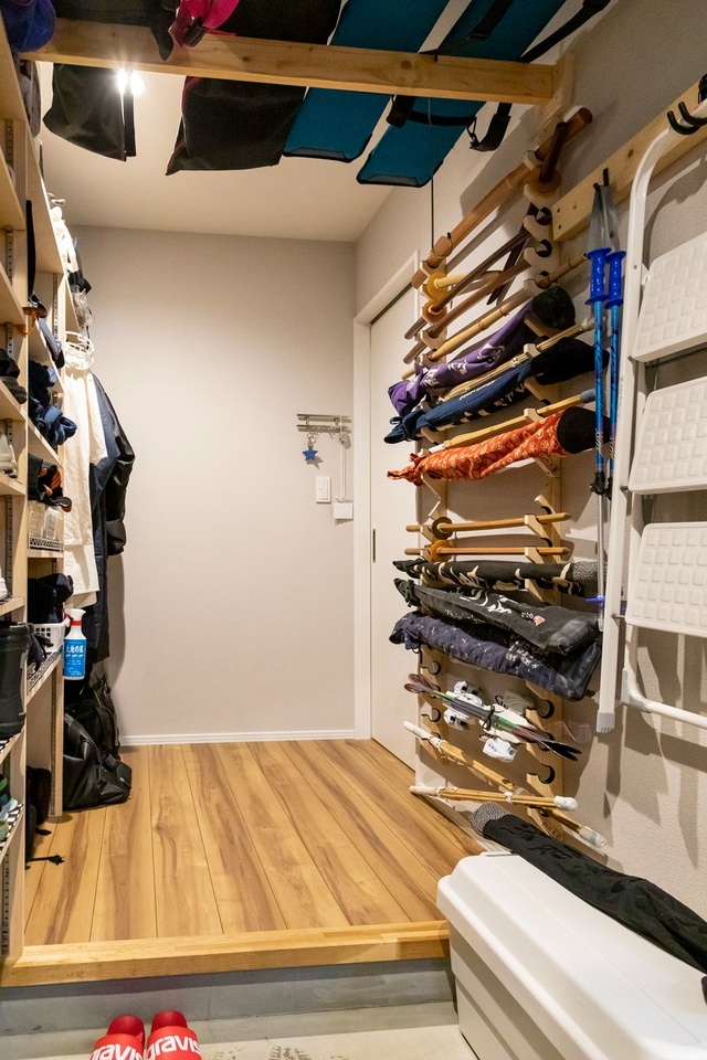 ファミリー玄関も兼ねたクロークは約5帖大!娘さん家族は全員が剣道をやっており、剣道着や袴、面や竹刀の収納場所が必須でした。