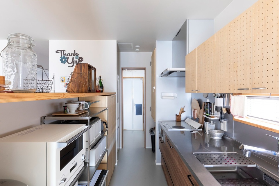使う家電や収納類を吟味して作ったキッチン。吊り収納は上部に空間をつくり、仕切り壁の上部もオープンにして、開放感を演出。吊り収納の扉は有孔ボードのように穴をあけて、細部までこだわっています。