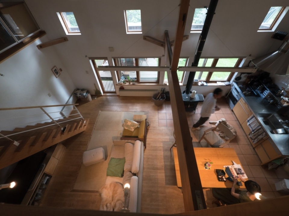 藤井さん「吹き抜け空間を作るメリットは、開放感だけでなく、子育て世代で家族の様子をリビングに居ながら感じることができる、リビングにある薪ストーブ1台で2階の個室も含めて暖かくできる点もあります」