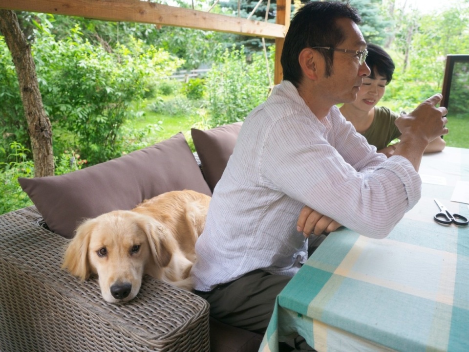 そこで、ご自宅と事務所にお邪魔しました。 旭川駅から約12キロ。東神楽町に藤井工務店の事務所と自宅、ご両親の住む家がありました。 さっそく藤井さんと、「ずんぐり」「むっくり」という2匹のゴールデンレトリバーがお出迎え。緑豊かな庭の奥には、三角屋根の事務所が見えています。