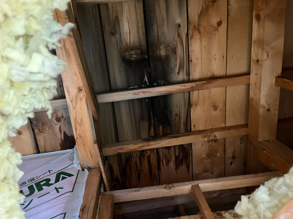 また、天井を剥がすと、屋根裏に雨水が染み込んでいた跡が確認できました。
