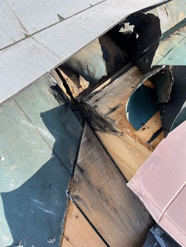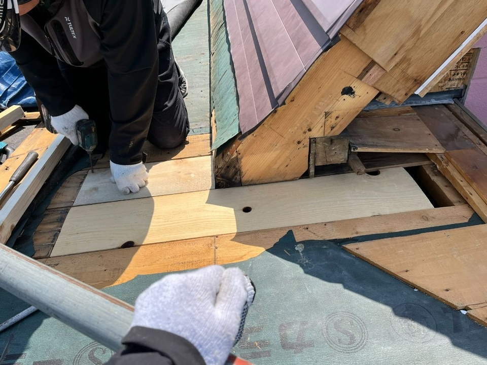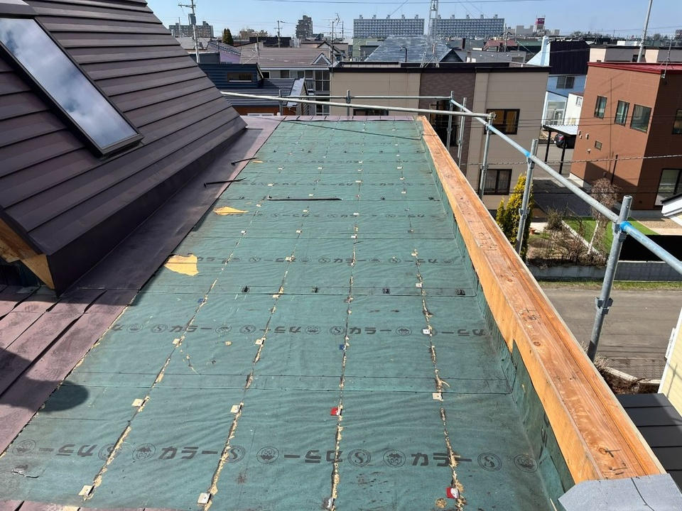 こちらは屋根を剥がした状態です。新たに改質アスファルトルーフィング(防水シート)を敷き、仕上げに向かいます。