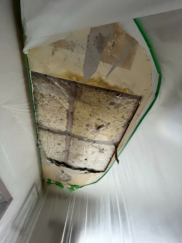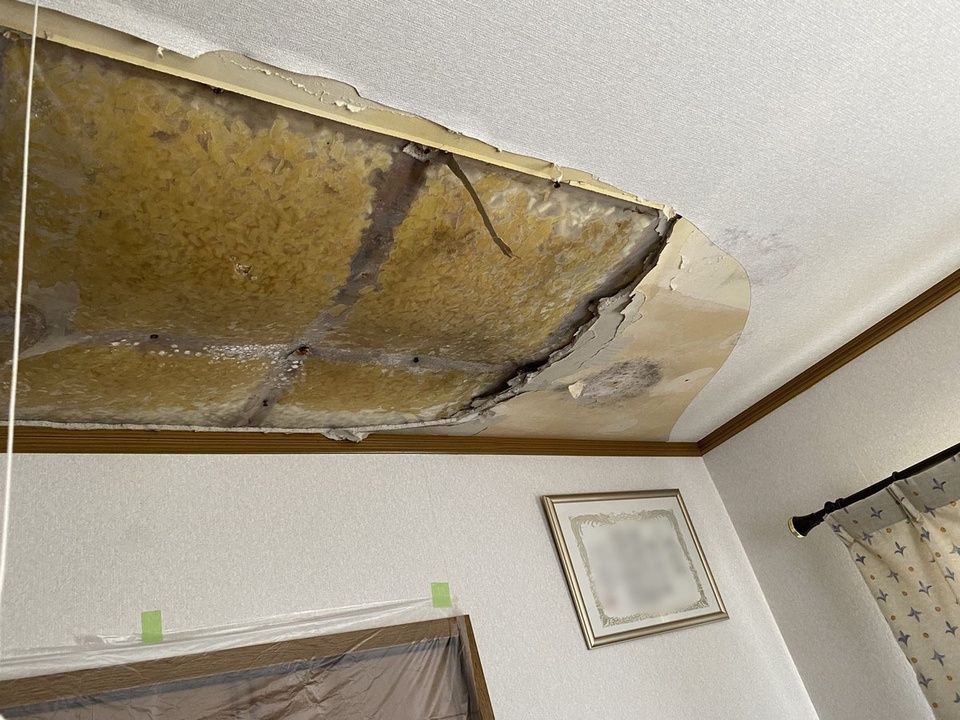「幽霊が出た?!」心臓が飛び出るほど驚いたFさんでしたが、よくよく見てみると、その正体はたっぷりの水を吸い込んだ天井の壁紙と石膏ボードでした。溜まった水を抜かねばと天井を突いたところ、大量の水がザバーッと落下。床掃除に追われることになりました。「18リットルのポリタンク2つ分ぐらいはあった」とFさんは振り返ります。