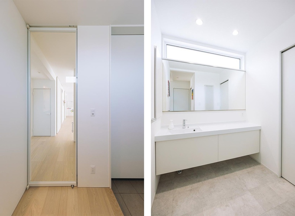 (写真右)玄関ホールからリビングに向かう場所に設置された、天井まで届く大きな鏡。「せっかくなら、と石井さんに提案してもらってこのサイズに。部屋を広く感じられる仕上がりで大満足です」