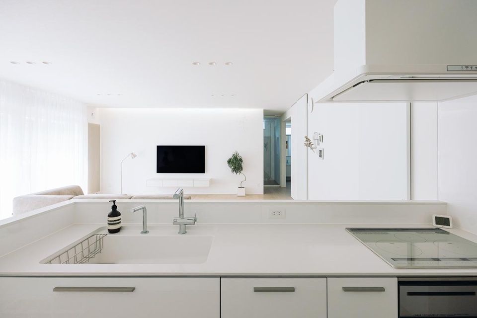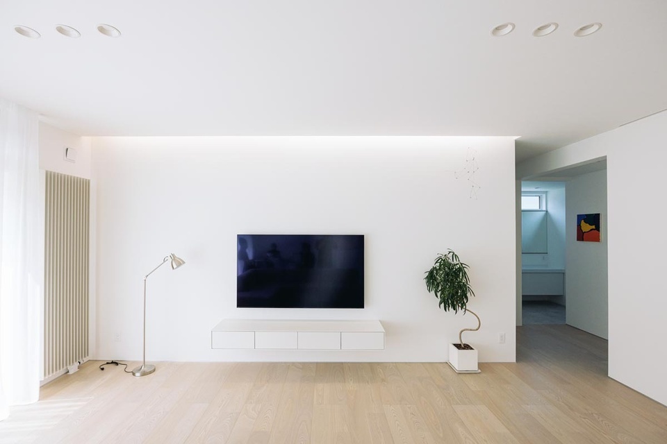 ほとんどのものが白で統一されている室内。「新婚旅行で海外に行ってから美術館めぐりが趣味になったんです。家づくりでも絵を飾った時の印象をイメージしながら、色づかいや空間の使い方を決めていきました」