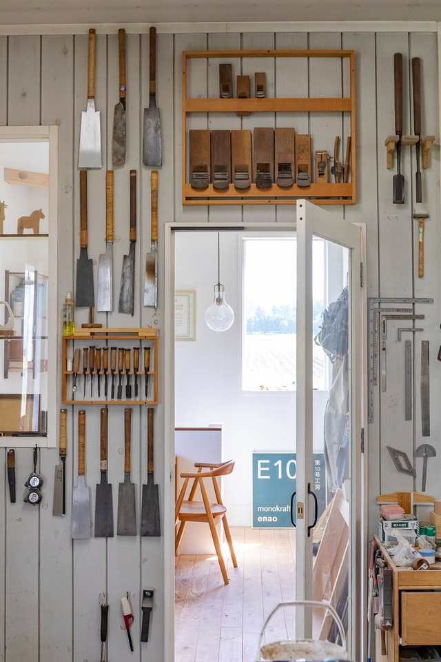 最後はenaoの遠藤さんと清水さんが共同で使っている家具工房にお邪魔します。外観はミントグリーンの縦板張りで、こちらはおふたりが留学していた北欧のテイストを感じます。