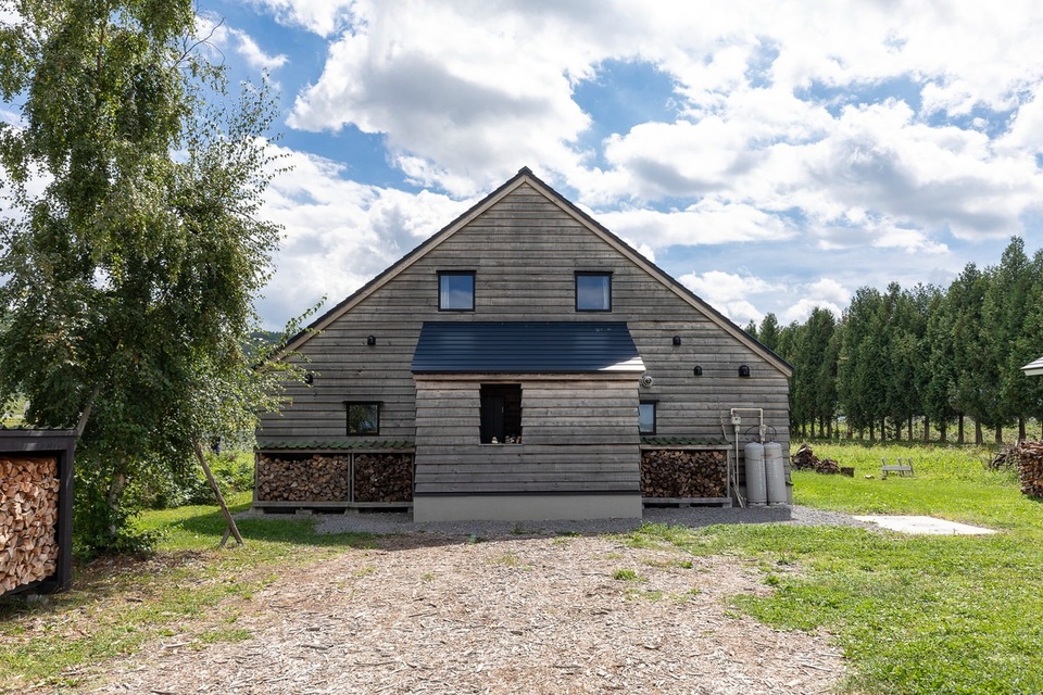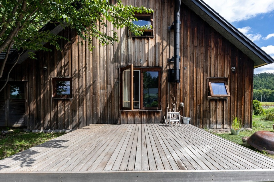 外壁装には道産トドマツを使用。工事は雅建築企画の野上さんが担当しました。木製サッシは津別町の山上木工による造作です。
