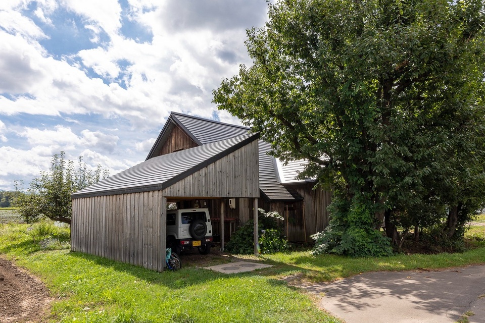 はじめに拝見するのは清水さんの自邸です。こちらは母屋に連なる車庫部分。傾斜屋根の内部はロフト物置としても使えます。