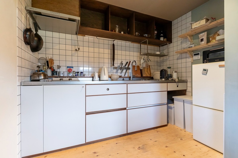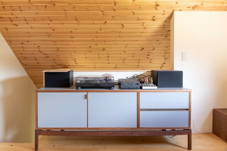 キッチンやオーディオラック、テーブルなどは清水さんがデザインしたものを遠藤さんが製作したコラボ作品。将来的にはゲストハウスとしての活用も考えているそう。