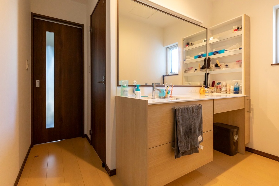 左は玄関ホールに出られるドア。使いやすい回遊式の動線です。洗面化粧台は2人の娘さんが同時に使えるよう、約180㎝幅のゆったりサイズを希望しました。