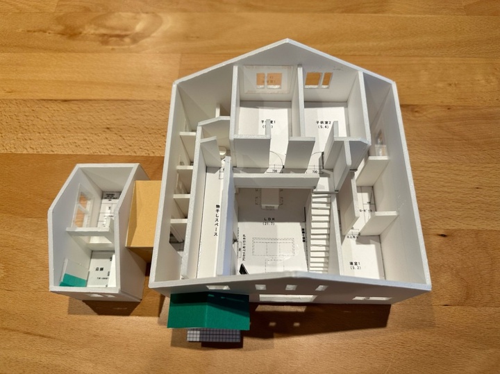 こちらはH邸の完成模型。なんと、プランが出来上がった際に、Hさん親子が作ったそう。吹き抜けのリビングを中心に居室が構成されています。(Hさん提供写真)