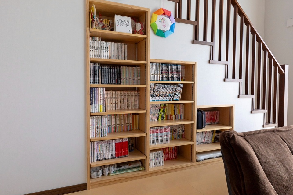 読書が趣味のご主人の希望で、階段下に本棚を造っています。