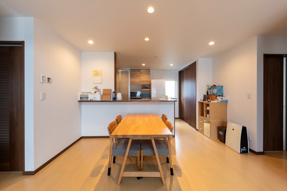 リビング階段の下、ダイニングの突き当りにご夫婦それぞれの個室が左右に配置されています。(写真のダウンライトが点いた一角)