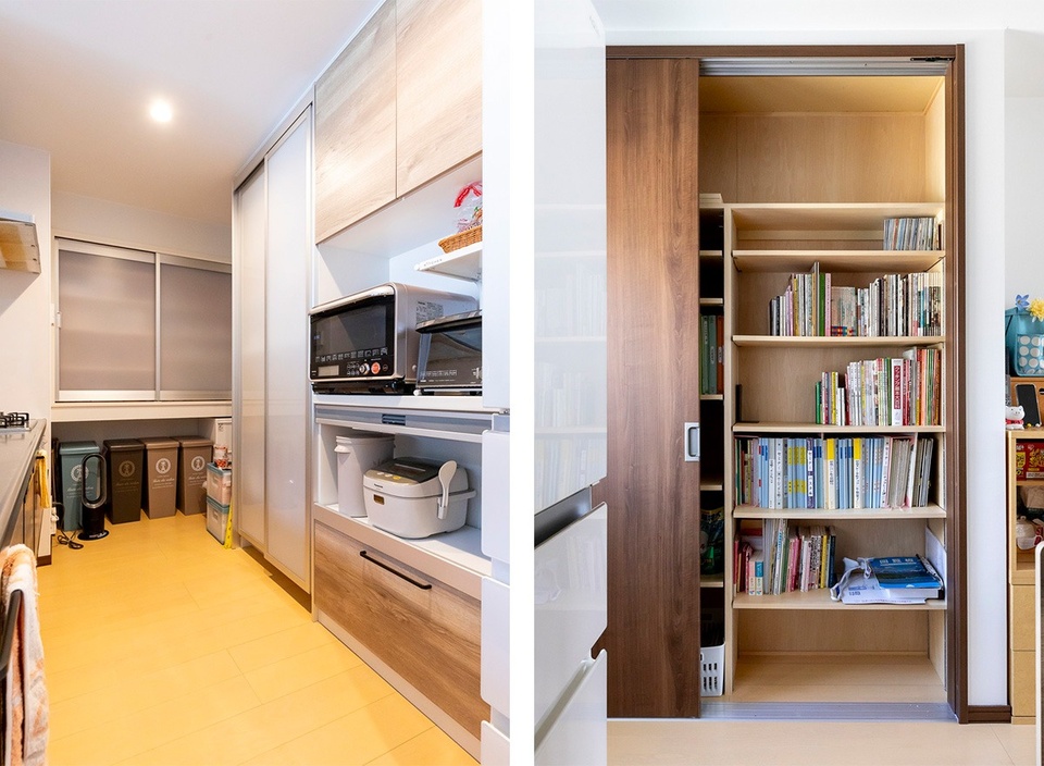 収納を多く確保したかったという奥さま。キッチンには中吊りの食品庫(左写真奥)や、大収納のカップボードが。さらに奥さまが仕事で使う資料や書籍などがストックできる引き戸収納(写真右)も備えています。
