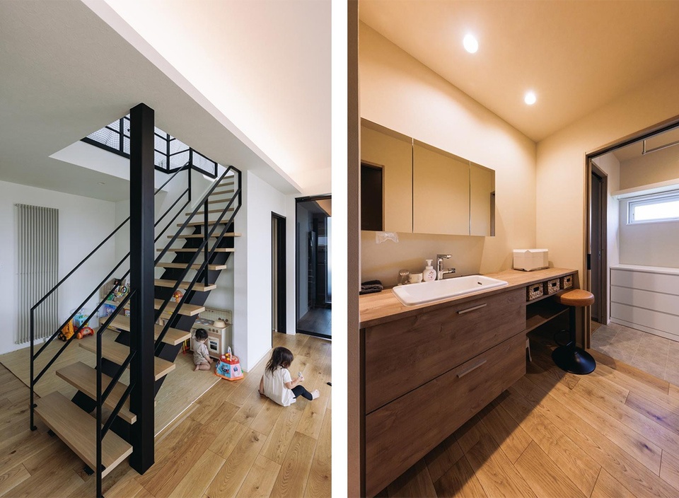 (写真左)階段の上は吹き抜け、下はお子さんのプレイスペースです。