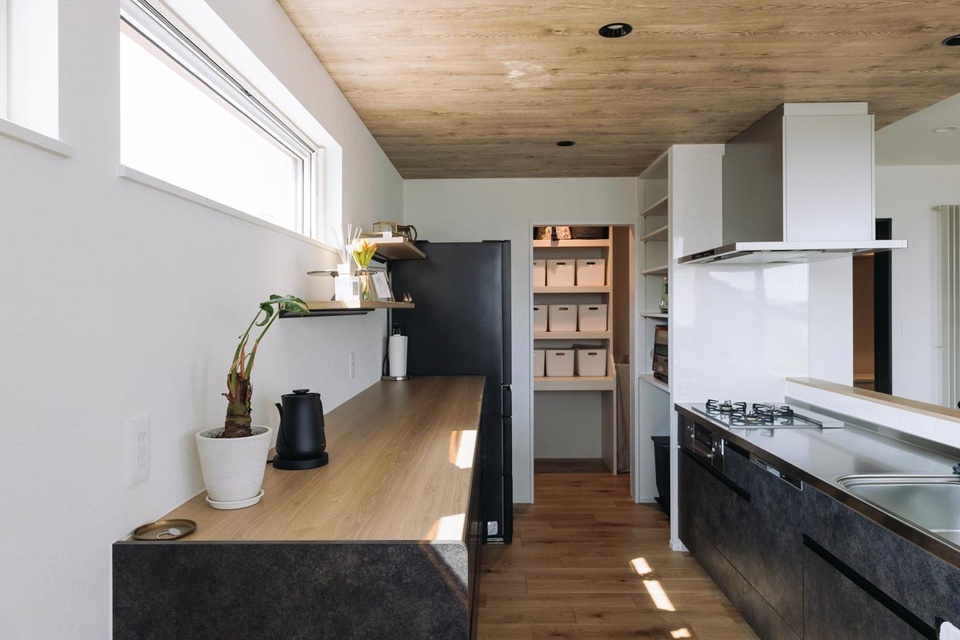 「食器棚の上に炊飯器などを置きたくなくて、家電はリビングから目に入らない奥の方に収納場所を設けています」とHさん。家電収納とパントリー、ふたつの収納を活用して美しいキッチンを保っています。