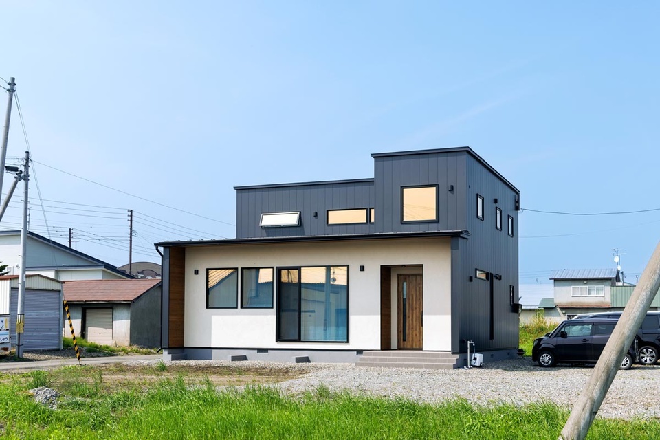 「スターバックスっぽいような、シックな感じの家がいいなと思っていました」というHさん。外観はガルバリウム鋼板と漆喰、木を組み合わせてデザインしました。