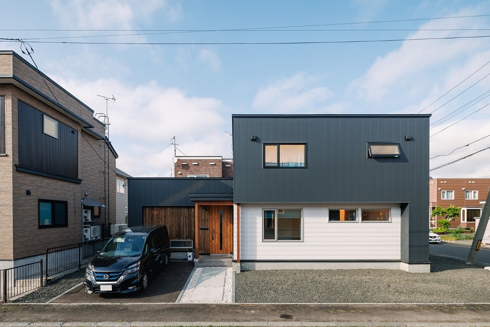 ガルバリウムと一部に木外壁を施した外観がモダンな雰囲気の一軒家。こちらは札幌市東区に建つ、Sさん夫婦とお子さん2人の住まいです。2022年5月に竣工しました。