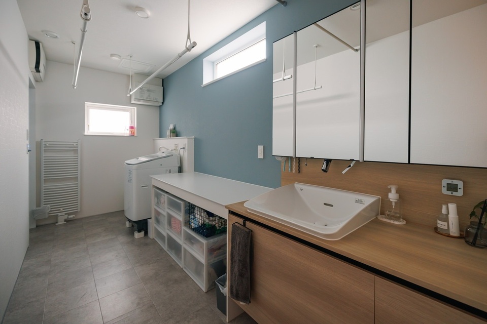 1階にある洗面脱衣室は、アパート暮らしで物干し場に困った経験から、できるだけ広く採ってもらいました。家族4人で使ってもぶつかったりすることがなく、物干し場としても十分なスペースがあり、満足しています。