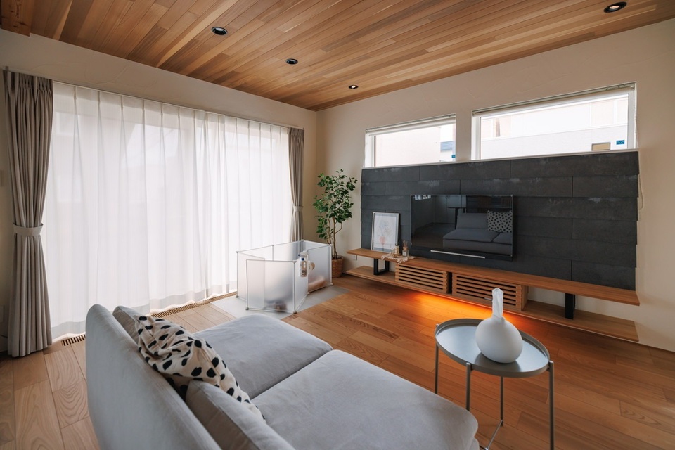 ただし、LDKの天井をレッドシダーの羽目板にすること、テレビ背面をコンクリート内装材SOLIDO(ソリド)でアクセントウォールにすることは希望しました。