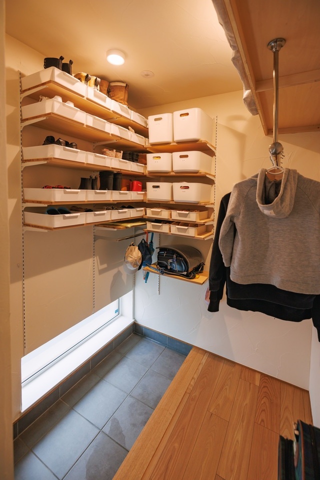 玄関にはランドセルやコートなどが置いておける収納棚を造作してもらいました。オープンにしたことで物の出し入れがしやすく、また物の置き場所が決まったことで家族みんなが片付けやすくなり、リビングが散らからずにすんでいるそうです。