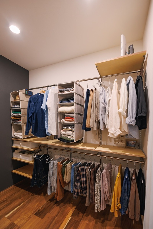 クローゼットもわかりすくきれいに整理整頓されています。転勤が多かったため普段からモノを減らす工夫をしたり、取り出しやすく掃除しやすい住環境が作り上げられました。