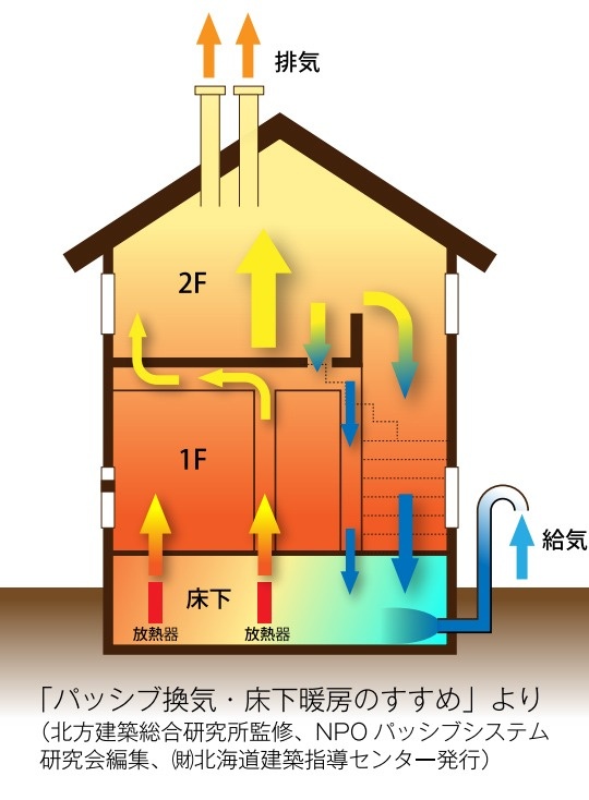 その点、パッシブ換気は給気口で屋外から採り入れた新鮮な空気が、床下から室内に給気されて家中くまなく循環し、汚れた空気は排気塔から排出される仕組み。空気だまりや室温差ができにくいため、結露やカビが起きる心配はほとんどありません。