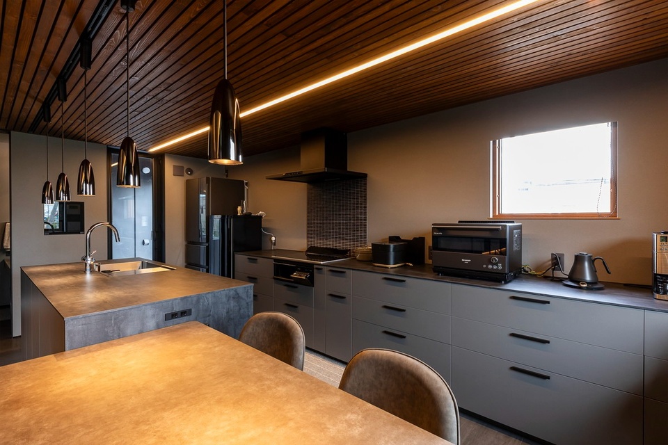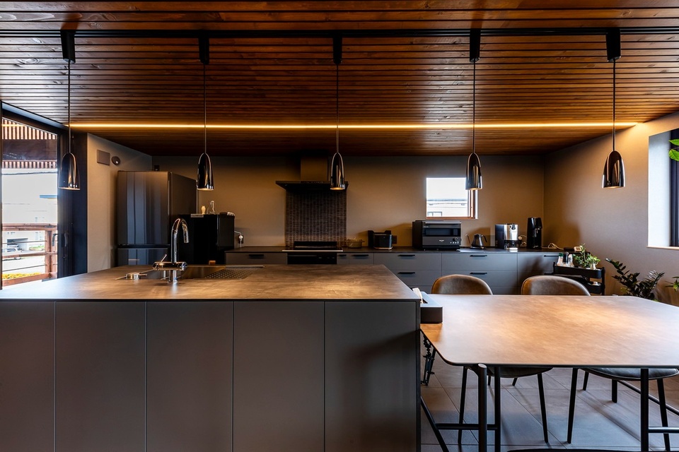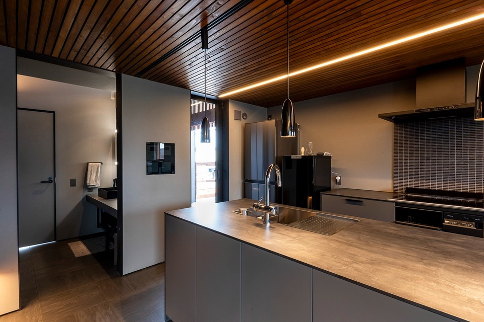 グレーの濃淡でコーディネートしたダイニングキッチン。天井にはやすりで表面を滑らかにしてから塗装をかけた胴縁材を貼りました。安価な材料を使い雰囲気良く仕上げるのは、設計担当の老川さんの得意技です。